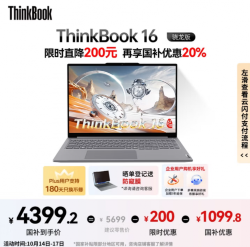 换新电脑不妨考虑ThinkBook 16 2025 骁龙AI元启版。其搭载16英寸2.5K 2560×1600分辨率高清屏幕,支持120Hz高刷新率,获得Eyesafe低蓝光认证,清晰、护眼;配置天禧个人智能体,支持离线使用,保护个人数据和信息隐私安全;配置FHD 1080p全高清摄像头,视频会议够清晰,同时采用ThinkShutter物理摄像头开关,更安全。ThinkBook 16 2025 骁龙AI元启版 骁龙X Plus 32G 1T 2.5K 120Hz原价5699元,京东限时优惠200元,黑龙江消费者享国补立减20%,到手价4399.2元。